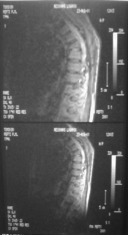 В настоящее время жалобы на отсутствие чувствительности в нижних конечностях, невозможность самостоятельной ходьбы (передвигается на кресле).КОНСУЛЬТАТИВНОЕ ЗАКЛЮЧЕНИЕ ЯМР-ТОМОГРАФИЧЕСКОГО ИССЛЕДОВАНИЯПроведена МР_томография грудного отдела позвоночника в сагиттальной проекции, с различной степенью контрастирования тканей, в режимах Т1 и Т2 В/И + МР-миелоурография. Визуализированы: спинной мозг с уровня D1 до уровня D12, тела позвонков D1-D12, межпозвонковые диски. Спинной мозг на уровне D4-D6 истончен с неровными нечеткими контурами, гетерогенной структуры, умеренно пониженной интенсивности на Т1 В/И, без очаговых изменений. Отмечается клиновидная деформация тела D5, снижена высота тела D4, структура его гетерогенная. Обращают внимание выраженные дегенеративные изменения дисков в грудном отделе позвоночника: снижение их высоты, изменение структуры изображения за счет исчезновения высокоинтенсивного сигнала от ядер. При исследовании в режиме МР-миелоурографии ликворный сигнал на уровне D4-D5 почти прерывается, интенсивность его существенно снижена.