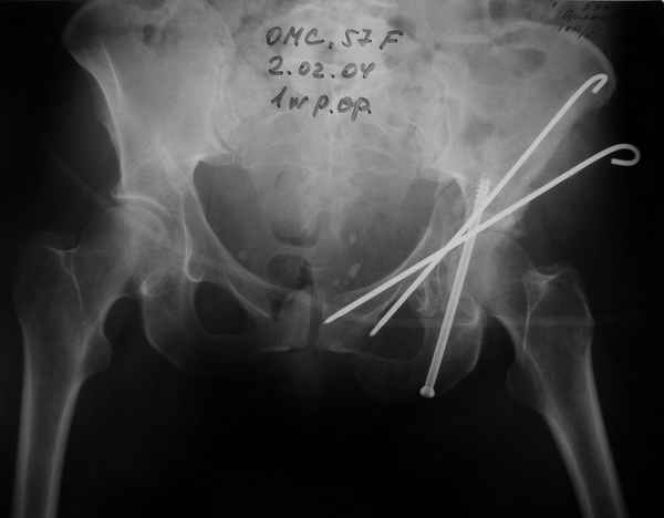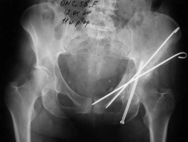 Однако есть альтернатива. Репозиция из подвздошного доступа тазовыми щипцами с разнодлинными браншами или тазовым пистолетом, а фиксация задней колонны через седалищный бугор или тазрвыми винтами 4,5 или каннюлированными 6,5 или 7,3. По-моему я посылал на ортофорум такой снимок, когда жаловался на ишемический неврит седалищного нерва через сутки после операции. Не забудь про шейку бедра - мне кажется будет хорош длинный PFN любой фирмы, какую ты найдешь, а нет так UFN + miss a nail, как это здорово делают мои земляки - Ебурбуки. Пока.