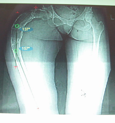 Моё мнение, что двойная остеотомия бедра с аппаратом Илизарова + Гексаподный механизм, или Тэйлора, В данной ситуации является методом выбора. Я очень извеняюсь за качество прилагаемых снимков, в которых я постарался отразить разницу междe одной и двумя остеотомиями бедра.