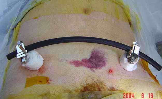 Наружный фиксатор на уровне spina anterior inferior в месте прикрепления прямой головки четырехглавой, где хорошая масса кости, провожу стержень под углом в направлении sciatic notch, который фиксируется дуговым стержнем, как на снимке, но возможны и другие различные варианты.