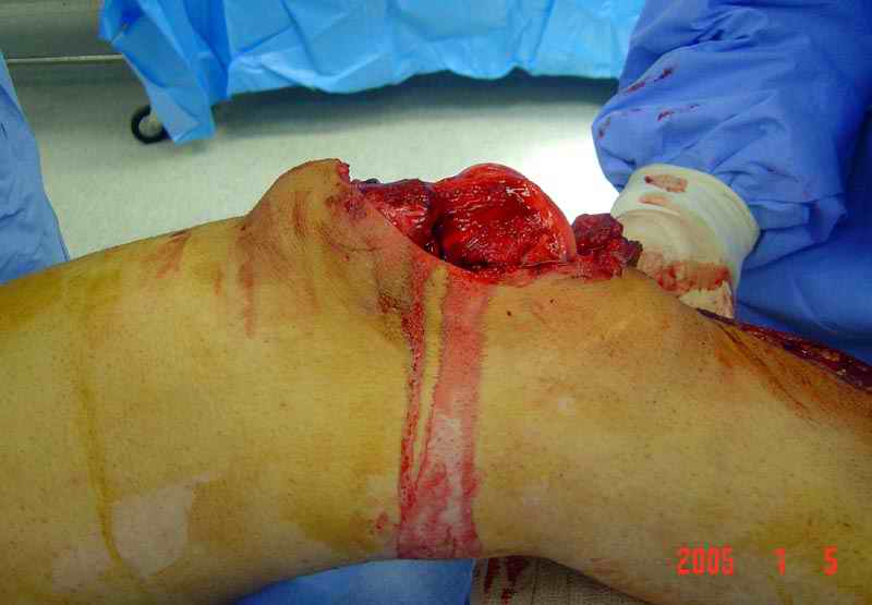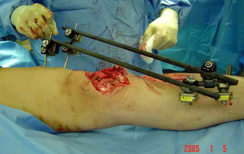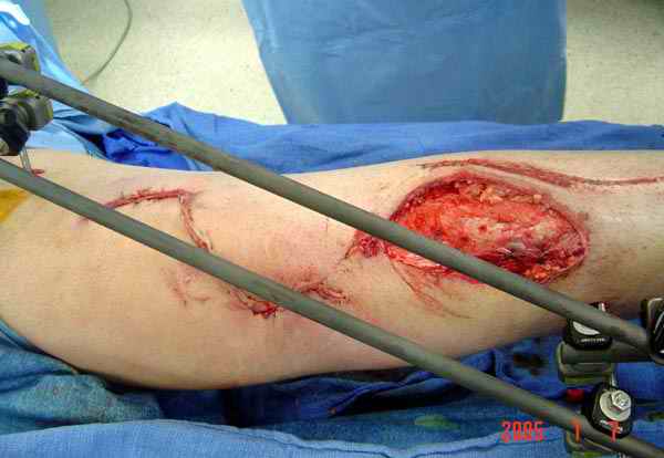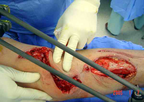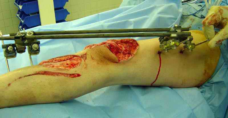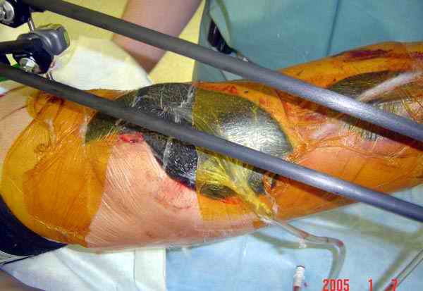 На операции: Irrigation&Debridment около 10 литров раствора, по два стержня в сегменте, фиксация диагонального, с дефектом, перелома надколенника тремя cannulated 4мм шурупами, ушивание поперечного разрыва связки 5.0 Ethibon sutures, разрыв находился на 2 см ниже надколенника (срез чем-то острым), повторная ирригация раны, взятие посева на аэробическую и анэробическую культуру, окончательная фиксация стержней наружного фиксатора 50см Carbon Fiber Bars, вакуумное закрытие. Мониторинг показал, что компартмент синдрома нет.