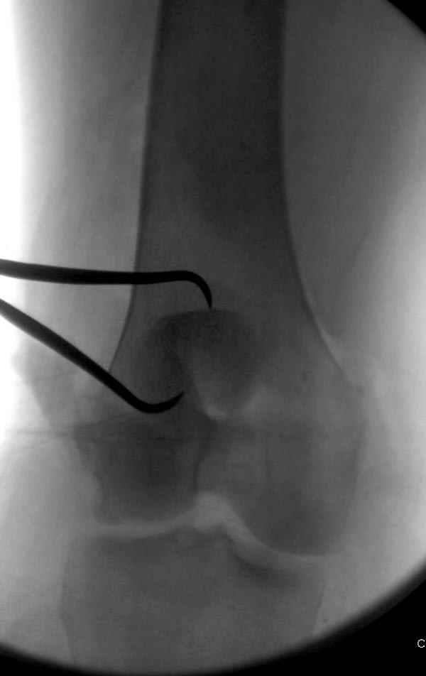 Внешний фиксатор держим около 6 недель, поэтому был выбран метод фиксации шурупами и еще линия перелома была диагональной, не было нужды в tension band technique, cannulated screws удобнее, провел спицы и по ним шурупы.