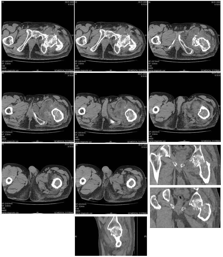 Действительно, проксимальный отдел бедра выглядит подозрительно. По-моему напоминает болезнь Педжета. Кстати, гистологическое заключение в таком случае часто звучит как "хроническое воспаление", "асептический некроз с элементами лейкоцитарной инфильтрации" и т.п. Далеко не все патоморфологи имеют достаточный опыт для дифференцировки костной патологии.