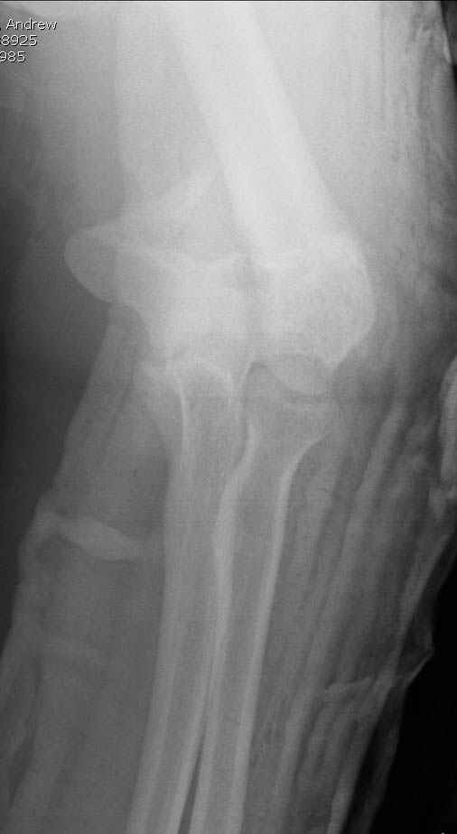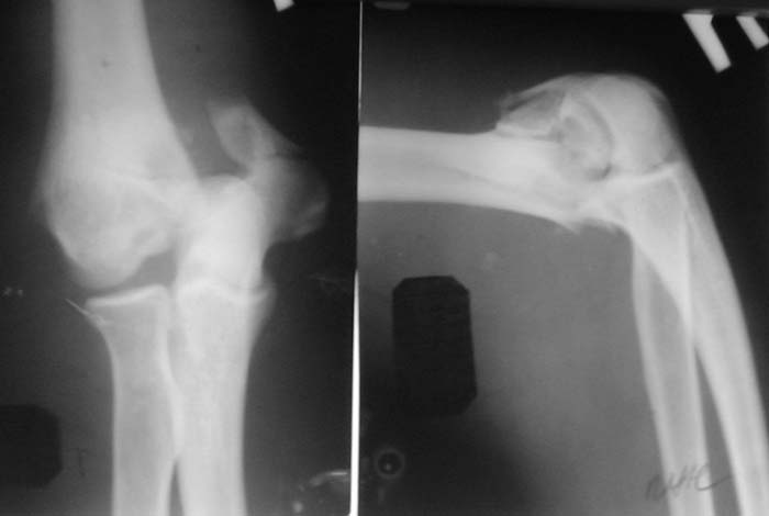 На шестой день сделали открытую репозицию чрезлоктевым доступом двумя locking plate, локтевой нерв был ушибленным, после операции положительная динамика в Flexor Carpi Ulnaris. Фиксацию локтевого отростка произвели tension band technique с дополнительным шурупом.
