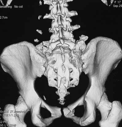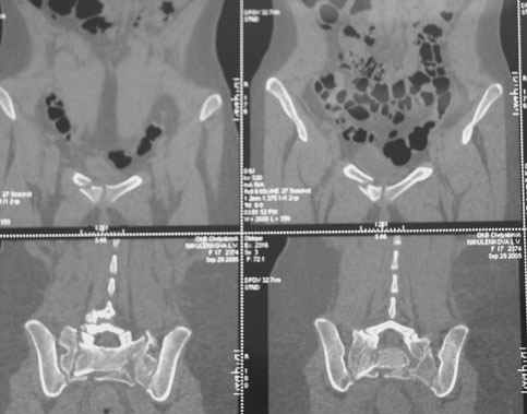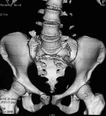 В отделение детской ортопедии нашей больницы поступила больная 17 лет. Травма 21.августа 2005г. На девочку в лесу упала береза. Доставлена в ближайшую ЦРБ. При поступлении установлен диагноз: Травматический шок 2-3 ст. Тупая травма живота. Забрюшинная гематома. Перелом костей таза с нарушением целостности тазового кольца. Перелом лонной и седалищной костей справа. Перелом поперечных отростков L3 - L5. Разрыв КПС справа. При поступлении выполнена диагностическая лапароскопия — выявлена обширная забрюшинная гематома. Было наложено скелетное вытяжение за бугристости обеих б/берцовых костей, больная уложена в гамак. Через неделю скелетное вытяжение демонтировано, гамак снят. Девочка уложена в положение «лягушки». Контрольные рентгенограммы через 4 недели после травмы. Заподозрен перелом дужки L5. Больная 26 сентября 2005 г. переведена в областную больницу в отделение детской ортопедии. При поступлении в локальном статусе: пальпация и перкуссия остистых и поперечных отростков L4-5 болезненная. Пальпация костей таза б/болезненная. С-м натяжения слабо положителен. Осевая нагрузка положительная. Движения в т/б суставах ограничены, болезненны. C-м прилипшей пятки отрицательный. C-м Ларрея и Варнейля отрицательный. Периферическая гемодинамика не нарушена.Неврологический статус: вторичная двусторонняя радикулопатия L5-S1. 29 сентября произведена компьютерная томография позвоночника и таза. < | >