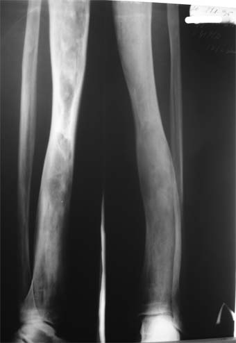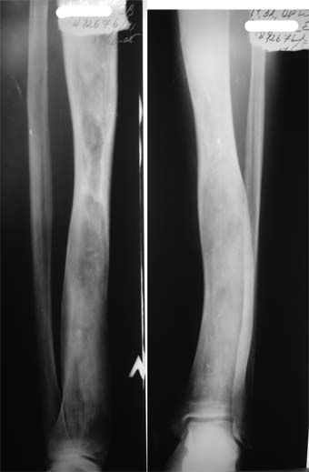 k> бедренной и большеберцовой кости. На рентгенограммах - тотальное разрастание