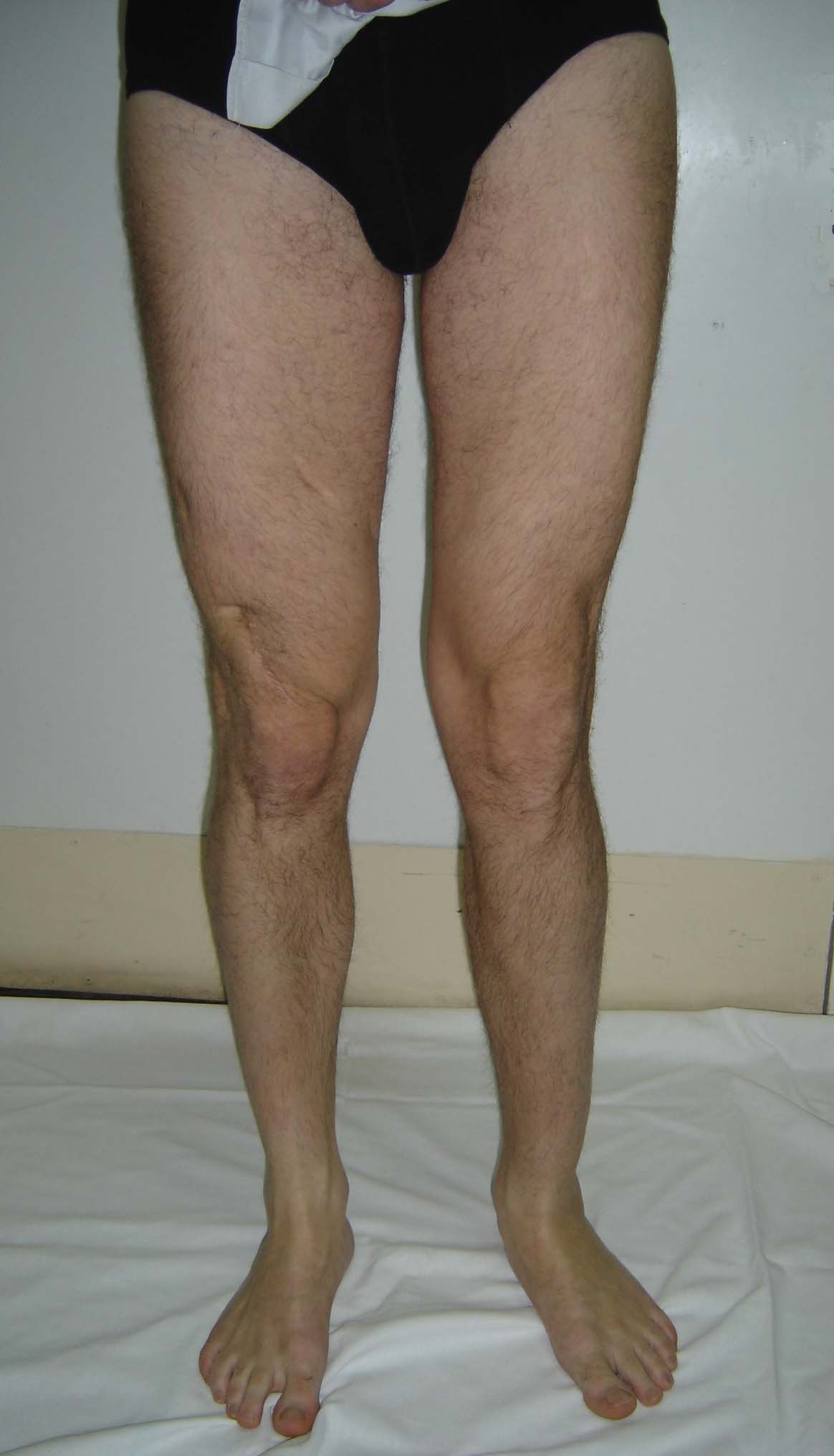 В настоящее время имеется умеренный рубцовый процесс правого бедра не мешающий на объем движений в суставах. В коленном суставе слева бедро обычное, голень - булавовидное утолщение проксимального конца большеберцовой кости. На рентгенограммах тотальное поражение кости с увлечением в процесс проксимального эпиметафиза, поражение характерно для болезни Campanatsehi