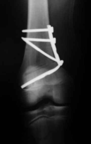 Как вариант решения прогрессирующей вальгусной деформации коленного сустава я бы предложил косую остеотомию дистального отдела бедра с фиксацией пластиной и компрессирующим винтом.