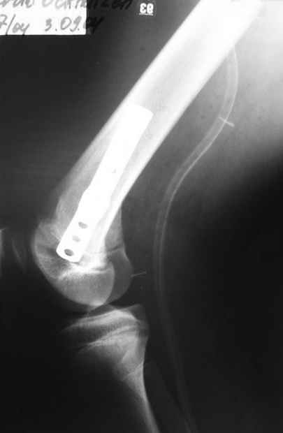 С учетом всего сказанного - наличия прогессирующего вальгуса конечности, довольно приличного объема движений, имеющегося, вероятно, некроза мыщелка бедра, наиболее рациональным представляется удалить пластину с б\б кости, произвести остеотомию б\б кости с коррекцией вальгуса, разгрузив тем самым наружный отдел сустава, и синтезировать фрагменты голени накостным фиксатором. Максимально тано начать восстановление движений в суставе. Скорее всего рано или поздно речь о протезировании всеже возникнет, но мы хотя бы будем иметь приличную ось конечности.
