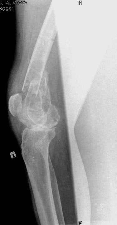 Это наше довольно давнее увлечение, еще в 2001 г. первые такие операции сделаны, и понравилось, хотя технически не очень просто. А потом и технология отработалась, и гвоздик создался под антеградную фиксацию дистальных переломов. Вот и получается, что если еще и латерализовать точку входа, то есть совсем абдукторы не задевать, то антеградный вариант должен давать меньше проблем. На основе этих наработок сейчас у нас А.Е.Виноградским выполняется кандидатская диссертация по дистальным переломам, видимо, будет и количественная оценка.