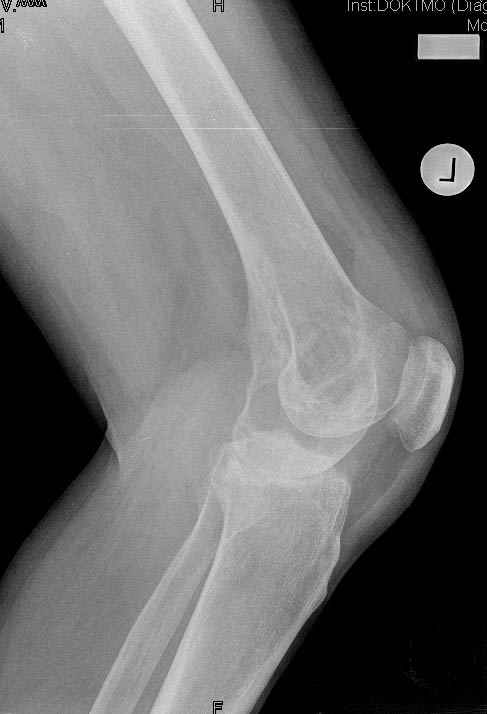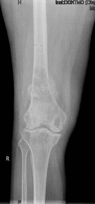 На рентгенограммах, помимо перелома, кистозные изменения на мыщелках б/берцовой кости и мыщелке бедра с другой стороны.