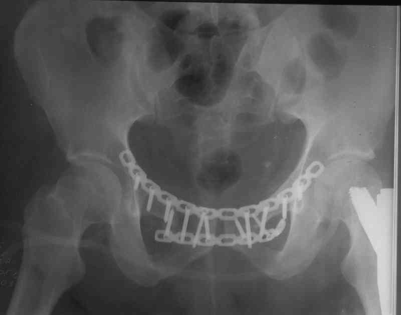 > метод фиксации таза: стержневой аппарат (тазового набора Илизарова нет в округе)