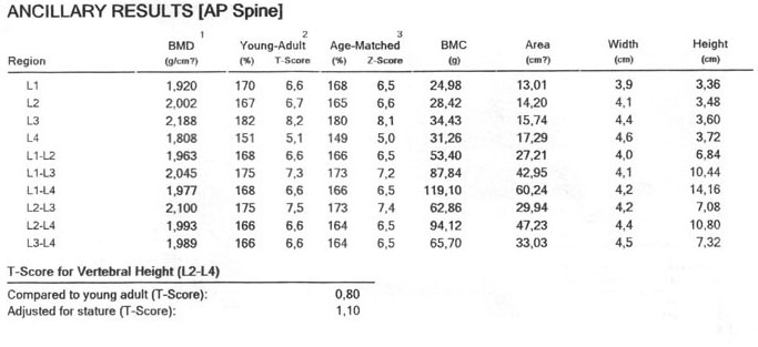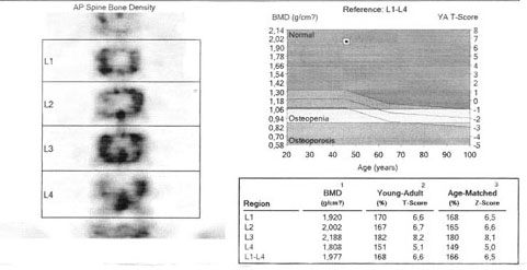 В октябре 2006 г. по поводу маточного кровотечения (менопауза 4 мес.) выполнено УЗИ - гиперплазия эндометрия, полипоз. Операция - удаление полипа, выскабливание полости матки. Цитологический анализ - пласты переходного климактерического эндометрия.Проведено комплексное исследование. В приложении: рентгенограммы и томограммы поясничного отдела позвоночника; радиологические исследованиямолочной железы, ЖКТ, почек, грудной клетки, анализы.УЗИ (18.12.06.) щитовидной железы, молочных желез - без патологии (умеренный фиброз по ходу млечных протоков).