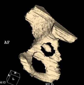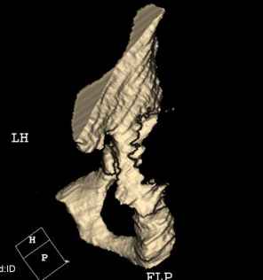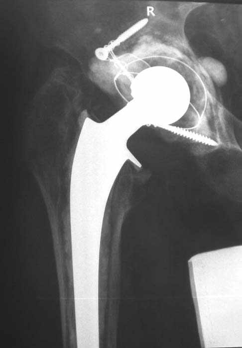Характер реконструкции вертлужной впадины не известен. Через 3 мес. после операции отметил щелчки и хруст при движениях в области эндопротеза. В анамнезе туберкулез легких. Сейчас, по заключению фтизиатра, в легких активного процесса нет. Местного воспаления нет.Предполагается нестабильность чашки в связи с бактериальным воспалением. Планируется удаление чашки и цемента, пластика дна измельченными аутотрансплантами и гидроксилапатитной керамикой, затем кольцо Мюллер, цементная чашка.