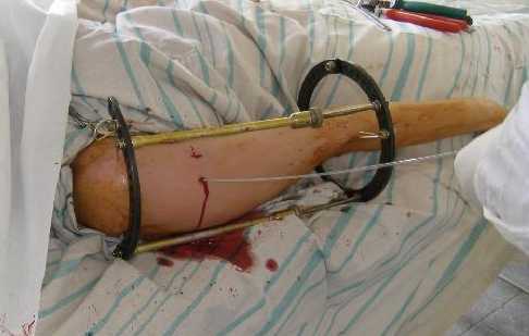 В приложении. Схема простая - по спице в каждый отломок, полукольцо проксимально, кольцо дистально, два телескопа. Как уже писал, ключевым моментом было введение спицы в плоскости диформации проксимального