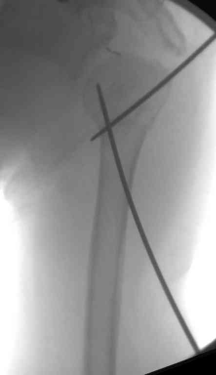 пример из нашей практики, вроде обычный перелом шейки, фиксированный популярным методом "Сиэтла" - множественными спицами 2.8 мм с резьбой на конце.