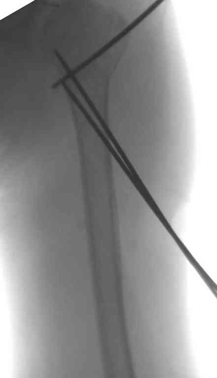 При первичном осмотре в поликлинике через 3 недели обнаружили миграцию двух спиц, срочно госпитализированному на второй день перед операцией на всякий случай сделали снимок, одна спица находилась под ключицей в шейном отделе (на снимке).