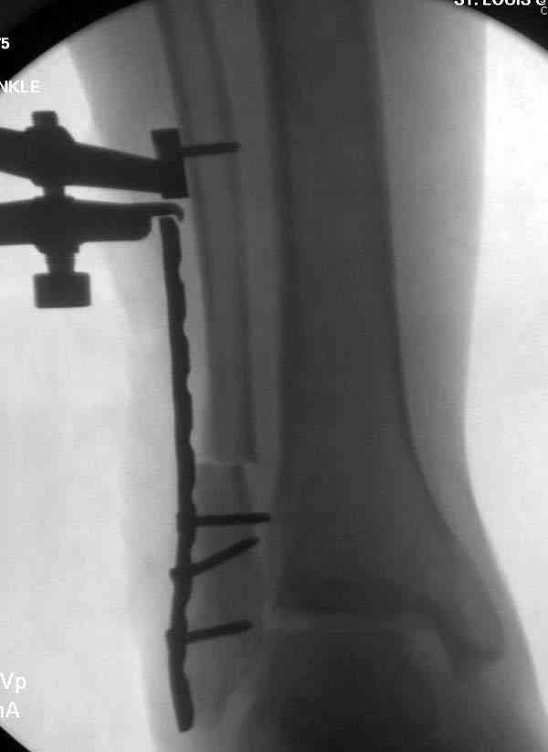 Проведена обычная стандартная процедура по исправлению неудовлетворительного состояния голеностопного сустава, где кроме удлинения малоберцовой с применением compression tension device за проксимальный конец пластины, проведено замещение трикортикальным графтом из крыла, освобождение синдесмоза и медиальной щели от