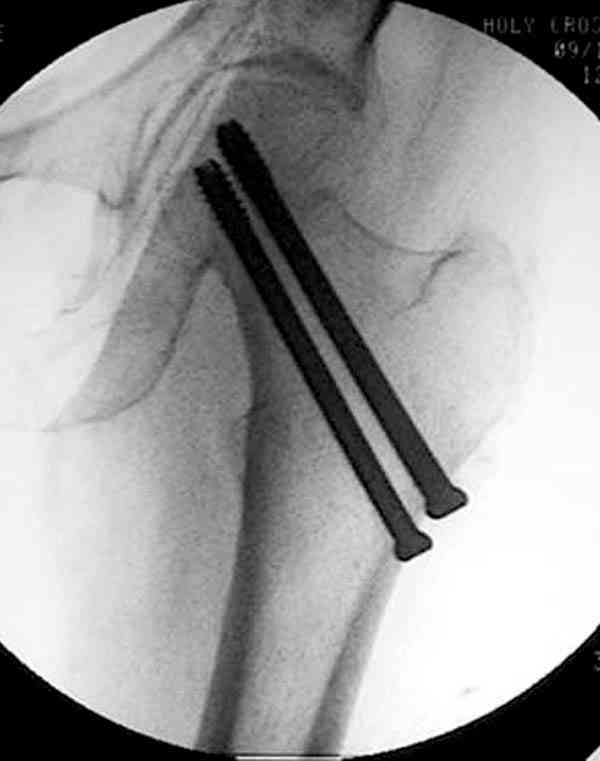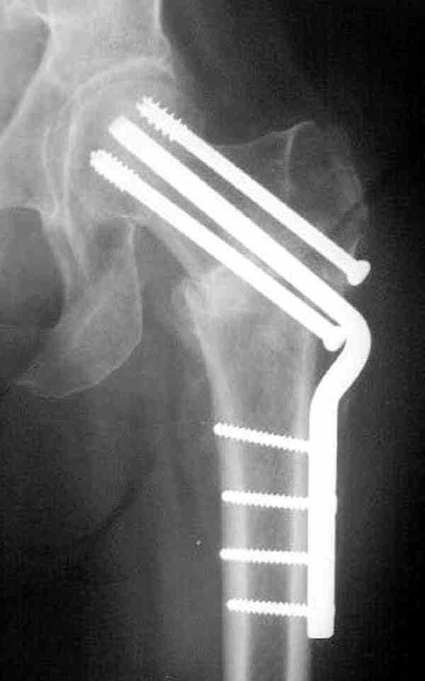 Здесь случай перелома из-за ослабления латерального кортекса через 3 недели после операции на шейке. Шурупы были установлены под большим углом, слабый латеральный кортекс не выдержал нагрузку.