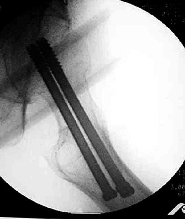 Коллега Челноков прав, здесь еще имеется риск перелома за счет ослабления латерального кортекса. Во время установки канюлированных шурупов за редким исключением спица вводится с одного раза, множественные попытки ослабляют латеральный кортекс, что станет источником перелома в этом месте.