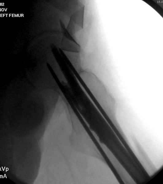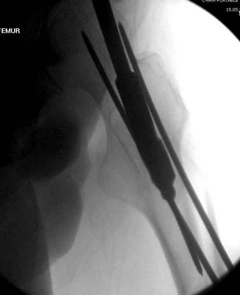 Для профилактики дальнейшего раскола в шейке предварительно во время проксимального рассверливания спереди и сзади провели временные спицы, которые в дальнейшем были заменены на шурупы (miss nail method)