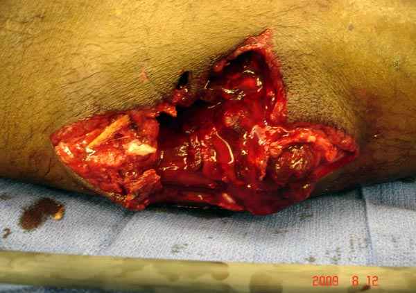 Уважаемые коллеги, Современная тактика лечения огнестрельных переломов вызывает споры. Опыты многих стран доказывает, что открытые переломы можно успешно лечить с применением внутренних металлических конструкций, включая гвозди. В западных странах более 25 лет эту методику применяют для лечения огнестрельных переломов. После применения адекватных методов по предупреждению осложнений, например, после промывания ран, огнестрельные переломы можно стабилизировать без боязни инфицирования. Здесь представлен больной 27 лет с ранениями, включая огнестрельный перелом большеберцовой кости. Стандартный аьгоритм: 11.08.09 доставлен в операционную, Irrigation&Debridment c фиксацией Наружным Фиксатором и вакуумирование VAC; службой травмы пройзведена ангиография с негативным результатом. (снимки 1-10) 14.08.09 повторная Irrigation&Debridment (чувстительственность из раны негативная) со сменой фиксации на медуллярный гвоздь и вакуумирование VAC 18.08 и 21.08.09 Irrigation&Debridment с сменой е VAC, после высеялся MRSA in thio т.е. на специальных срезах небольшое количество (11-13) 25.08.09 повторная Irrigation&Debridment. Пластик хирург не стал рисковать с Soleus flap из-за отечности, и применен Gastric flap, кожная пластика на медиальную и латеральную рану; аллографт из костных стружек с BMP. Поверхность вакуумирована VAC системой на 4 дня (14-16) Финальные снимки сделаем на днях. Djoldas Kuldjanov, MDDepartment of Orthopedic SurgerySt. Louis University Medical Center