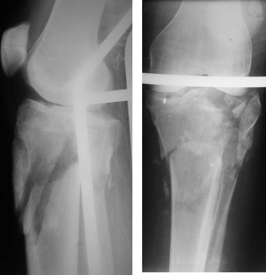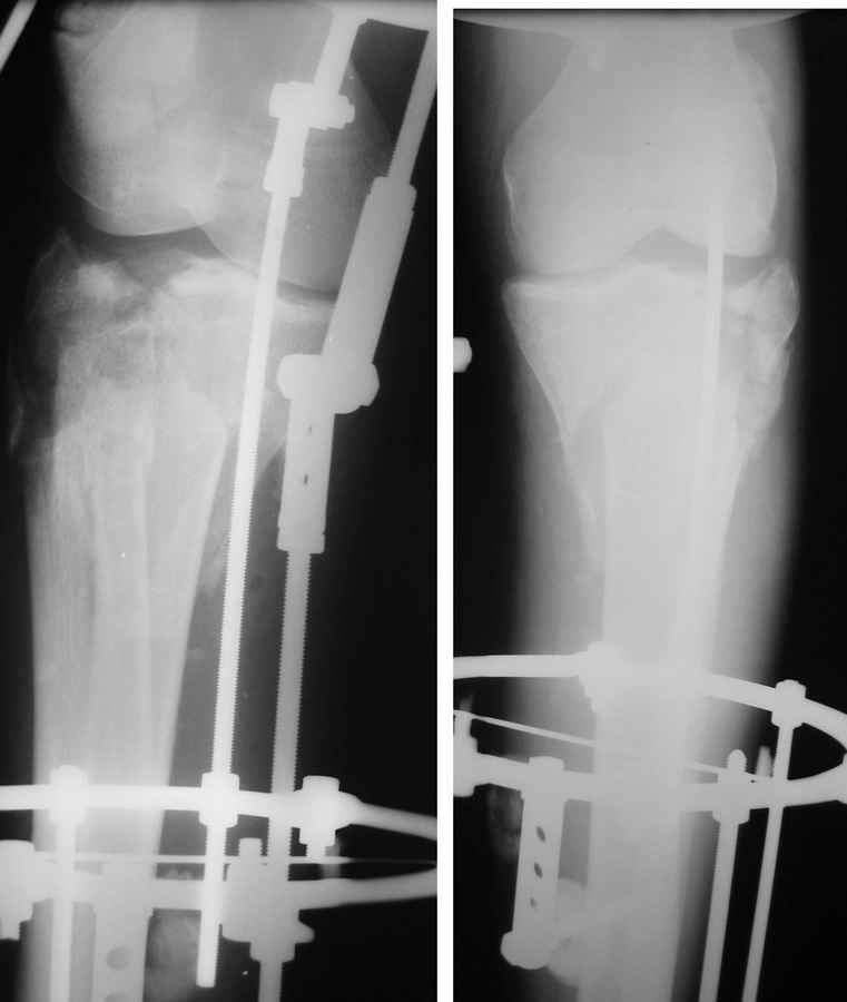 Очаг некроза 4 на 5 см по передней поверхности голени не оставил никакого варианта кроме внешнего остеосинтиеза.