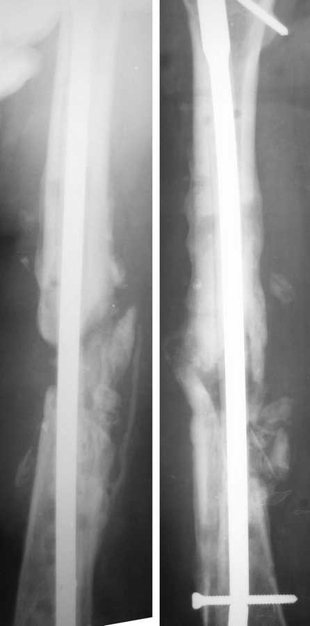 Здравствуйте дорогие коллеги.Продолжение случая. Две недели назад Павел Иванов любезно приехал в нашу больничку и прооперировал пациентку.Сначала разрезом около 10 см вскрыли зону ложного сустава. Мощные рубцы, отсутствие инфекционных очагов. Особо углубляться не стали, ушили рану, выполнили остеосинтез стержнем, предварительно покрыв его цементом с антибиотиками.Послеоперационные снимки - в приложении.Всё было хорошо. Ранняя активизация, нагрузка с костылями, постепенное увеличинеие движений в колене. На 8 сутки - повышение температуры, эвакуировали серому около 100 мл из области раны, в последующем скудное негнойное отделяемое. Впринципе постепенно затягивается.Отсутствие болей, уменьшение отёка, увеличение движений в колене, но как и до операции - температура до 37,8 в середине дня. Думаю, всё-таки какое-то инородное тело нельзя исключить. Но сейчас в любом случае контроль, ожидание сращения и ЛФК.