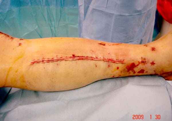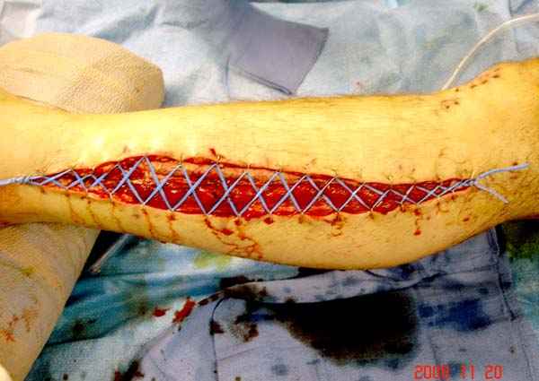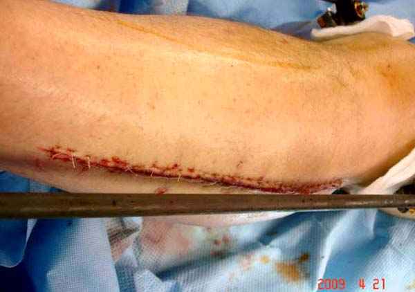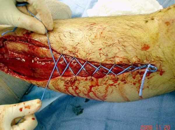 Предпочтительно сначала закрыть медиальную сторонну, а затем латеральную, потому что при невозможности закрытия кожных ран, наружную сторону легко закрыть кожной пластикой.