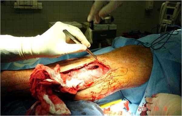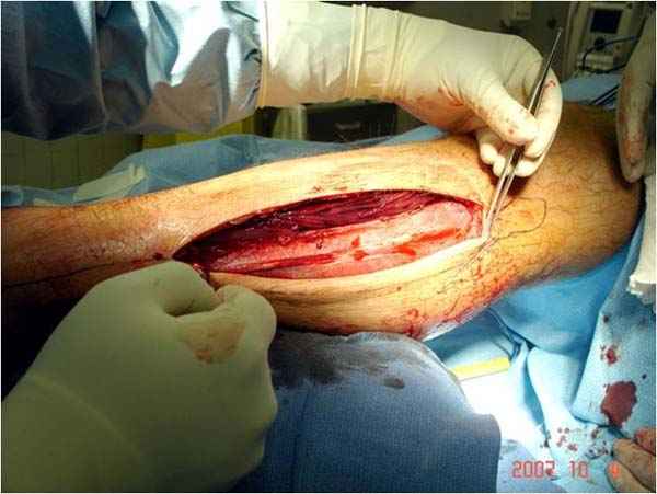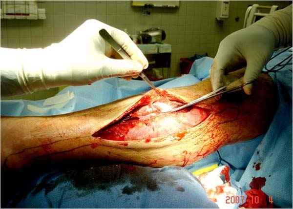 Нет специфического инструментария для фасциотомии, кроме обычного скальпеля и ножниц. Кожа разрезается снаружи и внутри, в зависимости от конечности, иногда разрез достигает 25-30 см. Из одного доступа ножницами вскрываются оба компартмента расширением ран проксимально и дистально.