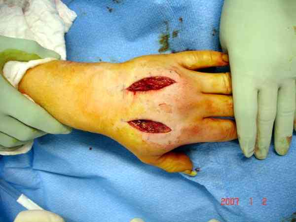 2.Как выглядит КС на верхней конечности?(тоже фасциотомия?)