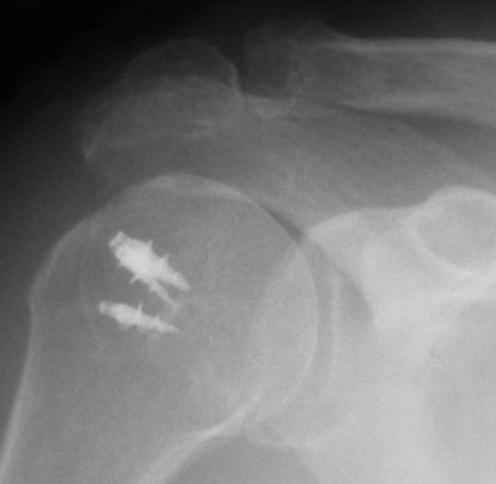 Верхний подвывих в такой ситуации может быть проявлением ротаторной артропатии, как следствия более массивного, чем частичный разрыв сухожилия надостной мыщцы, повреждения вращательной манжеты. И значит нужно думать о том, насколько полно восстановлена манжета, адекватно ли был расценен объем ее повреждения. Что за шов применялся? Якорных винтов не видно. И почему гипсовая иммобилизация? Есть прекрасные надувные отводящие подушки, позволяющие ранние движения.