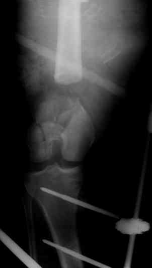 Как-то бы еще и умудриться движения в колене сохранить. Может быть, на первые недели фиксировать все аппаратом, согнув колено до прямого угла и задав правильную длину. А как раны заживут, заштифтовать, заместив дефект кейджем,