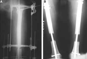 Если у Вас возникнут какие-то сомнения, то возможно наложение гибридного циркулярного-монолатерального дистракционного аппарата на левое бедро и выполнение остеотомии в в/3 бедра. Почему монолатеральный гибридный аппарат, а не аппарат Илизарова? Эта конструкция гораздо легче переносится пациентами, в ней гораздо удобнее проводить местное лечение ран.