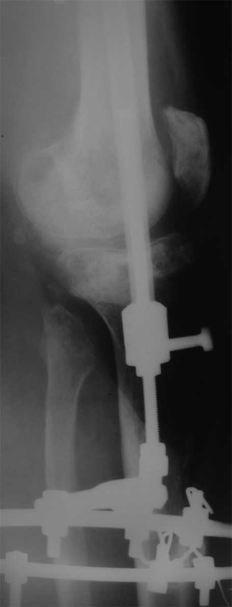 У меня были сходные соображения. Хотел посоветовать начать с перемонтажа аппарата - провести спицы через проксимальный отдел большеберцовой и убрать все с бедра. Если движения будут - думать про замещение дефекта. Если нет (и/или если пациент не настаивает на их восстановлении любой ценой) - то артродез с использованием длинного интрамедуллярного стержня решит проблему дефекта большеберцовой кости "автомагически".