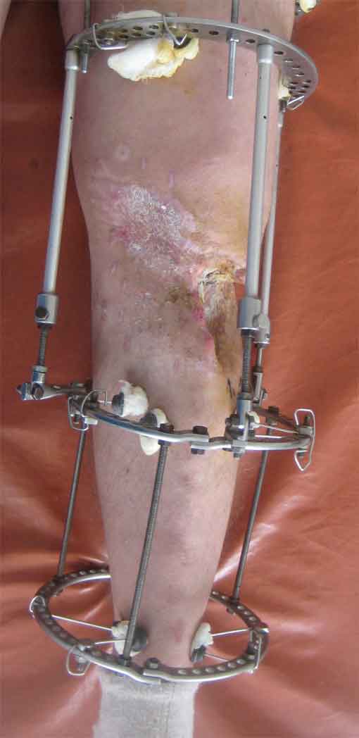 Я бы сделал пластику мягких тканей (торакодорзальный лоскут совместно с микрохирургами или пластику латеральной головкой икроножной мышцы) и выполнил бы краевой отщеп большеберцовой кости для его дистракции аппаратом в проксимальном направлении (рис. 1 – пример применения отщепа (авторство не мое), рис. 2 – схема предлагаемого варианта замещения дефекта кости).