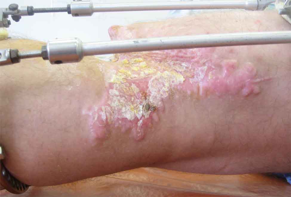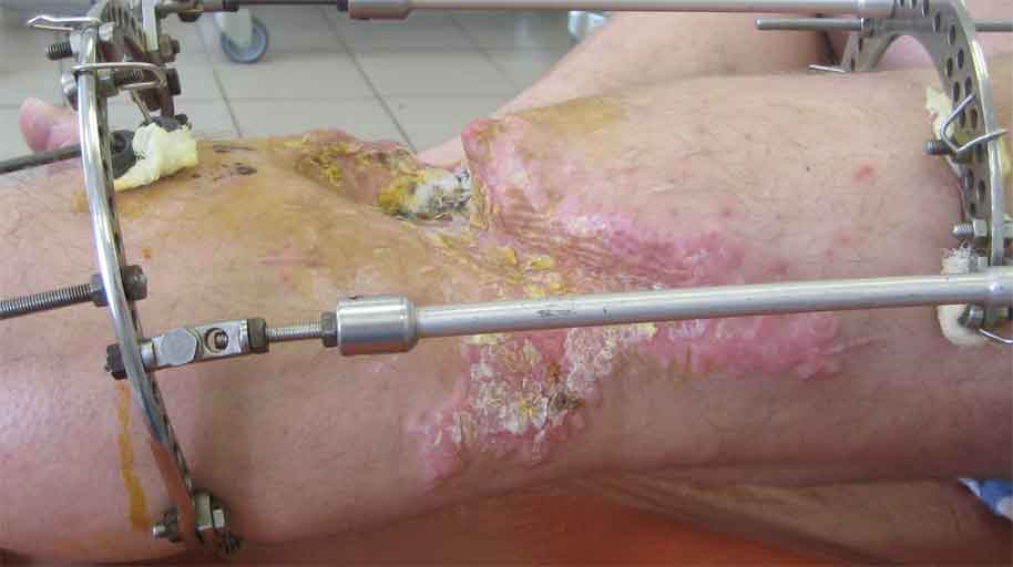 ... Движений уже нет и не будет. Медиальный краевой отщеп на фоне такой картины мягких тканей тоже имеет сомнительный прогноз. Даже если все получится, функциональность этой ноги под большим вопросом. Современные протезы после ампутации бедра дают намного лучшие функциональные результаты, и значительно быстрее.